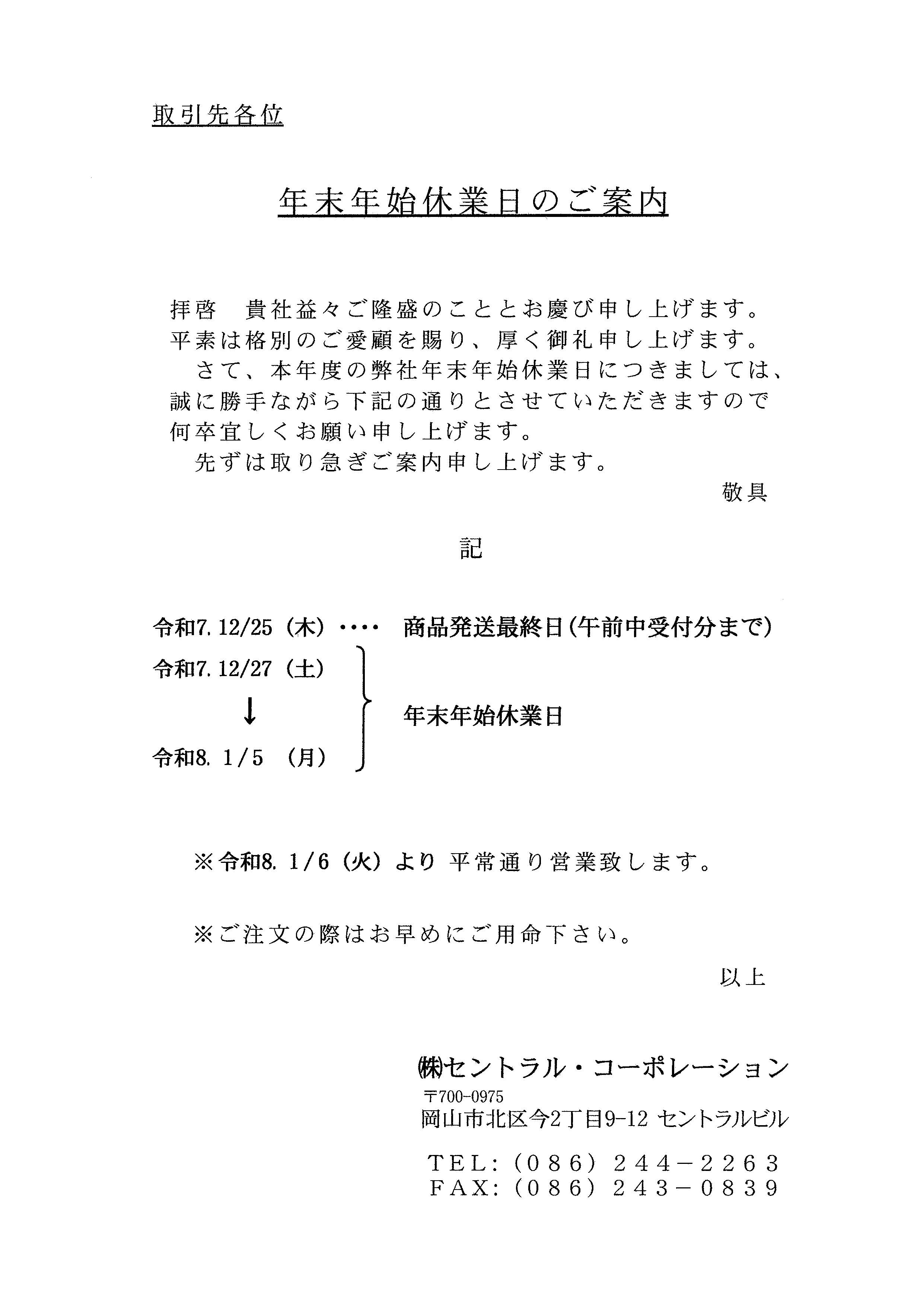 誠に勝手ながら、年末年始休業日のため、12月27日(土)〜1月5日(月)まで年末年始休業を休業とさせていただきます。 ご不便をおかけいたしますが、何卒ご理解賜りますよう、よろしくお願い申し上げます。